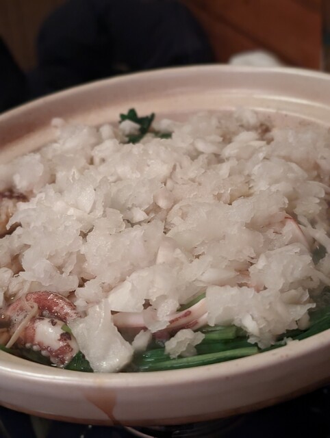 平日、オープンの18時に合わせて予約してもらい、二人で伺いました。予約時にお鍋のコースで、と言われたそう。お店の前につくとすでに満席の札。時間ぴったりに開店、案内されて2階席に。畳の2階、中央には囲炉裏、女将がいしり餅の番をされています。