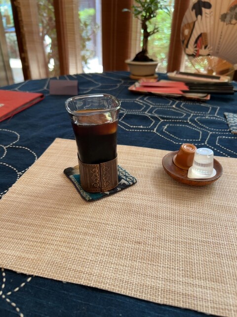 私は**窓際のこたつ席(夏仕様で布団はなく、藍色の刺し子クロスが掛けられていました)**へ。