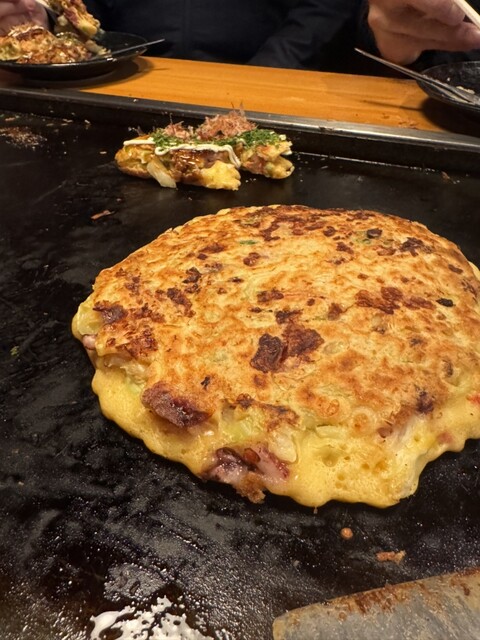 お好み焼きは、3人のおっさんで食うには小さいかも。でもおツマミには最高のサイズ!!