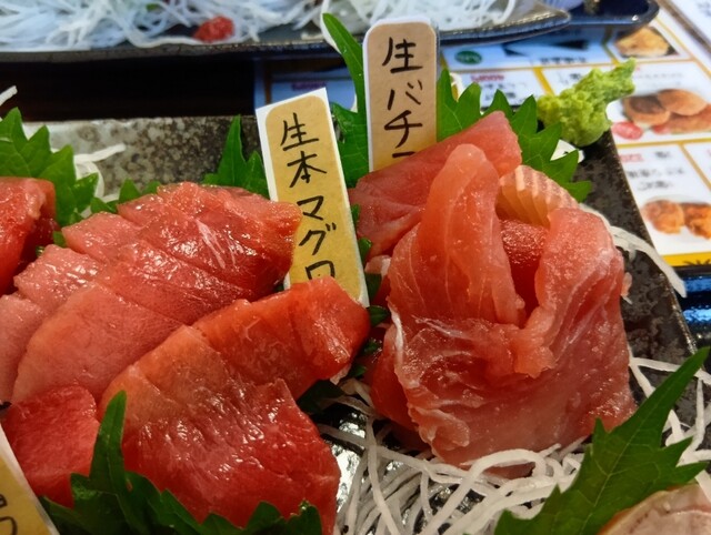 鮪丼!(手前から時計回りに生本マグロ、本マグロカマトロ、生本マグロ中落ち、生バチマグロ)