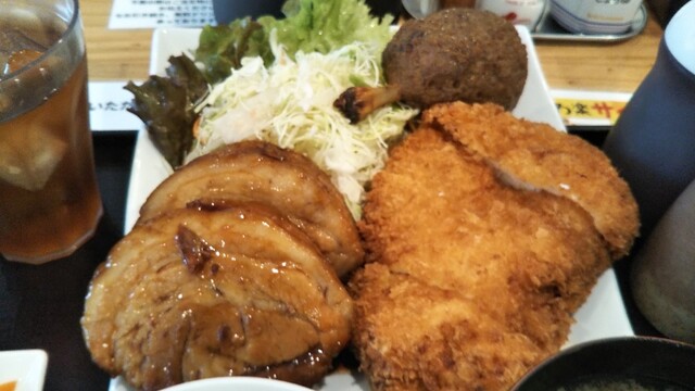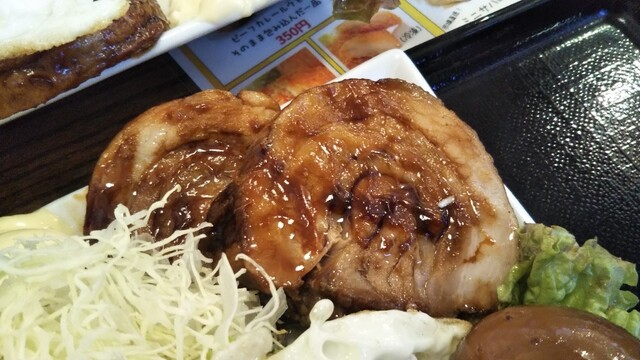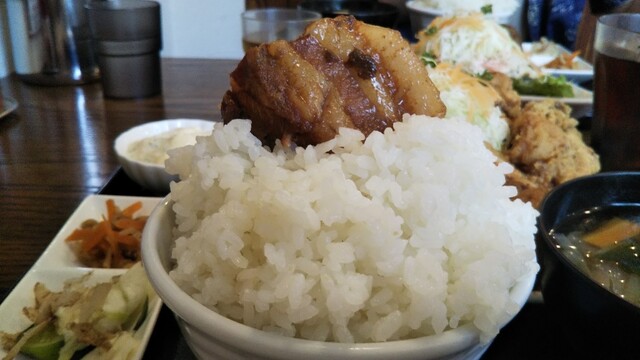 肉の日プレート定食に、豚の角煮かチャーシューが入っていますように!と願っていたら、豚の角煮が入っていました♪
