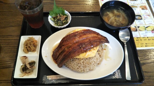 刻んだうなぎの蒲焼きとうなぎのタレで炊き込んだ山盛りご飯の上にふっくら玉子焼き、そして、その上に大きなうなぎ1匹分がドーン!と鎮座しています
