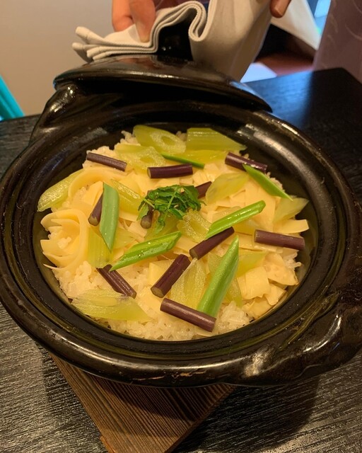 えびたけのこアスパラに鯛の白子ソースかけ、山菜のお椀、鯛イカのお造り、鮎の稚魚、ホタルイカ、ます、鯛の卵入り豆腐、鯛とたけのこのふきのとうソース、たけのこごはん、いちごとだいだいのムース