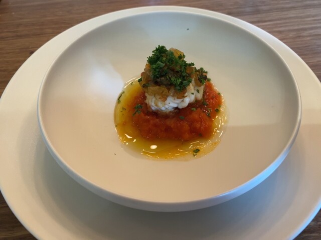 前菜二皿。まずはカツオ。高知との縁を感じさせる一品で、焼き茄子の甘味と香ばしさが見事にマッチ。白子とトマト、エシャロットソースの酸味が濃厚さを引き締め、メインへの導入として完璧。
