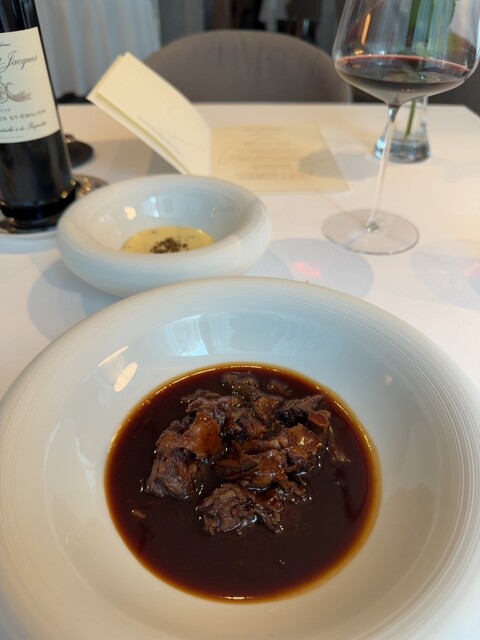 ソース・ビスクの鱗焼き、牛テールの赤ワイン煮込みは、シンプルな構成ながら期待値を大きく超える完成度。塩味がしっかりしつつクリアで旨味が強いソースは圧巻。語彙力が追いつかないほどの美味しさで、ぜひ体験してほしい。