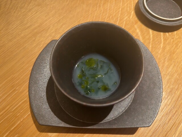 さらに野菜・魚介の端材を使ったスープ。食材と生産者への敬意が料理として成立しているのが良い。海苔の風味が乗り、貝出汁が強く、やや白濁しつつ澄んだ印象もある。締めの“おまけ”ではなく、ひと皿として完成している。