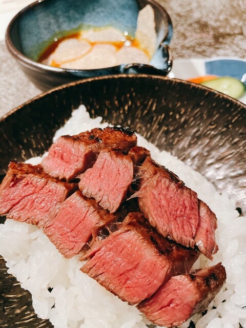 お肉を最高の焼き加減で焼いて頂いて最後のシャトーブリアン丼へ。トリュフと温めた黄身の入った卵を溶き絡めてシャトーブリアンとごはんの上へ。