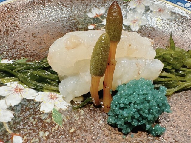 ○お造り 兵庫県浜坂漁港のモサエビ 海老の卵 土筆 神馬草