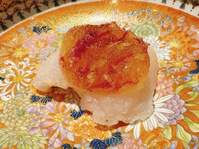 ○松葉蟹を練り込んだ蓮根饅頭。蟹出汁餡掛け