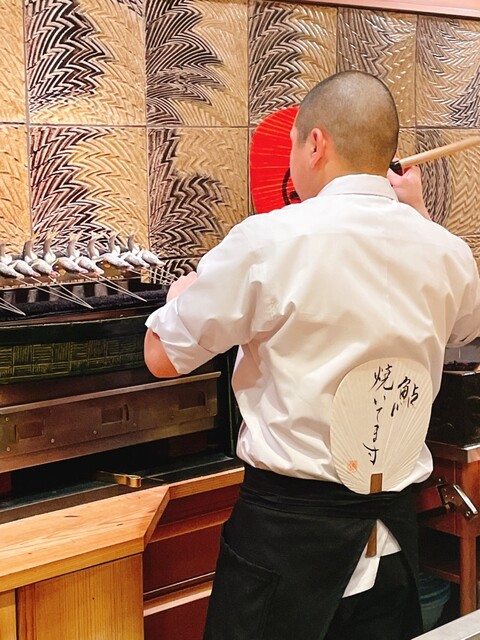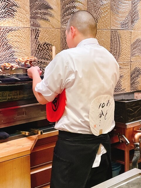 焼き上げるお弟子さんの背中の内輪に書かれた文字が変わっていき美味しさはもちろん楽しさも満載でした。