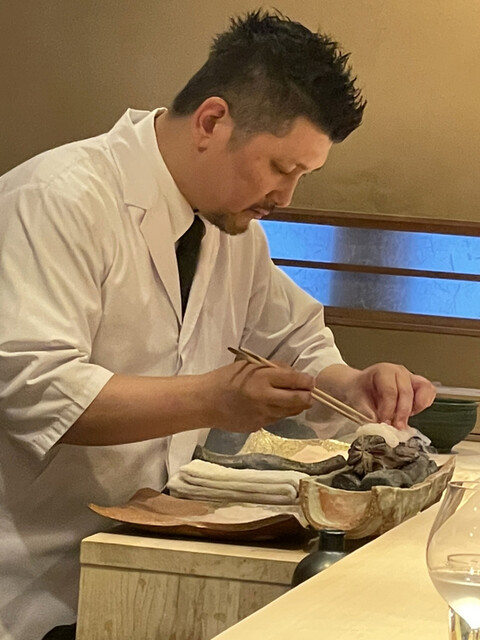 最初はずわい蟹と湯葉の先付け。上に載ってる小さな粒は岩梨と言う山梨だったかな?の標高3000メートル付近で採られた超レアな食材らしい。うん、美味しい。