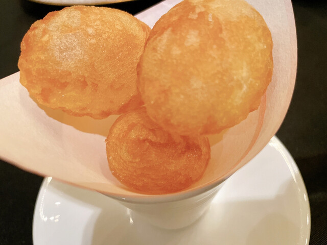 まずはシャンパンで乾杯。一品目のメニューの前にアミューズ「手長海老と雲丹のホットサンド」