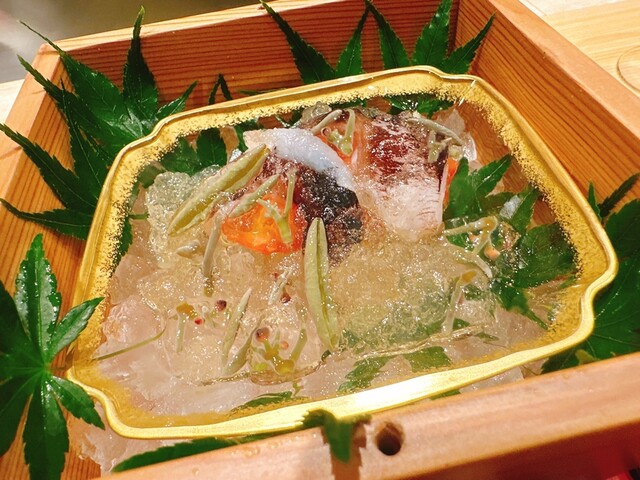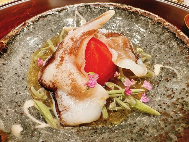 ○先付 天然とり貝と山菜 土佐酢ジュレ