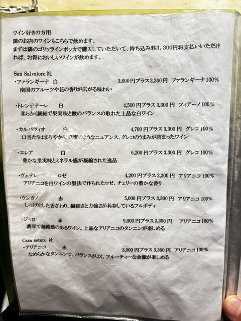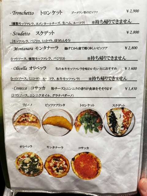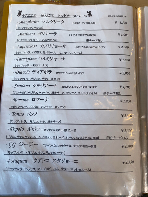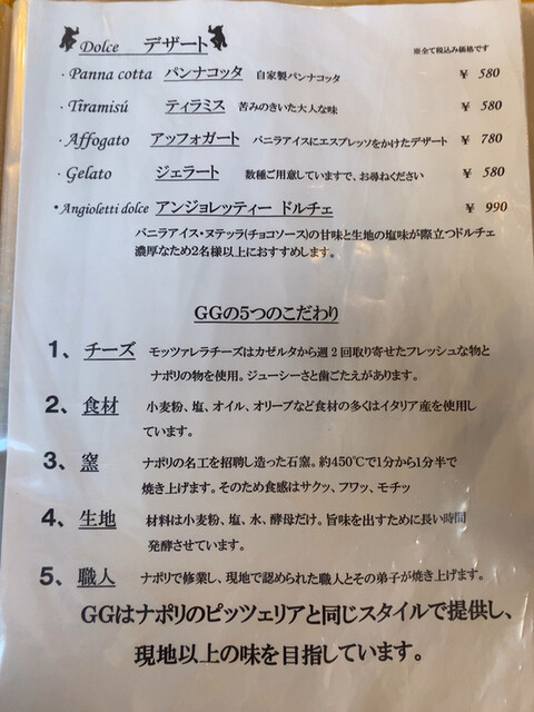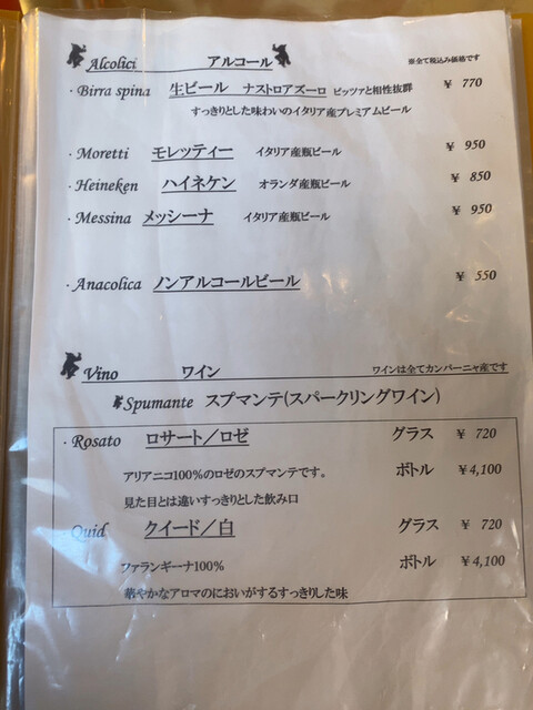 ドリンク、ドルチェついてピザの価格。