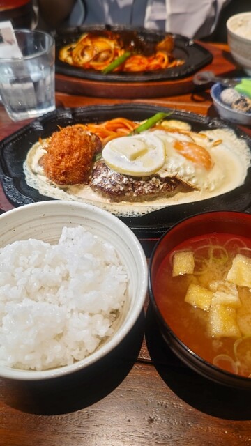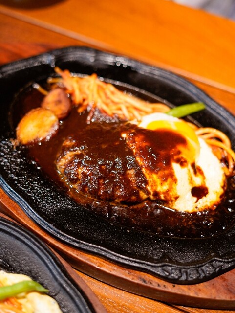 席について運ばれてきたのは、ジュージューと音を立てながら登場する鉄板ハンバーグ。
