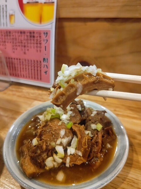 最初に運ばれてきた牛もつ煮込みは、濃厚な味噌の香りが立ちのぼり、一口食べるとモツがとろとろに煮込まれているのがわかる。