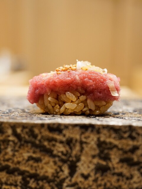 名物のおはぎは、叩いたネタがふわっとほどける食感で、この店らしさを感じる一貫。