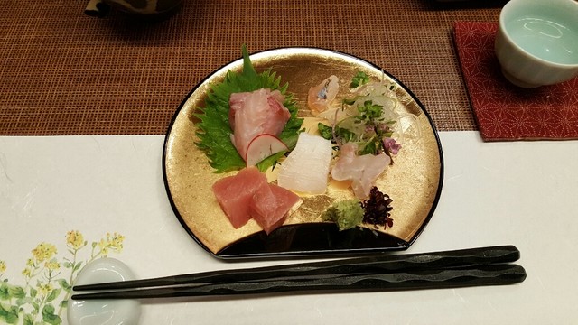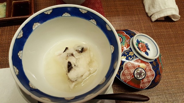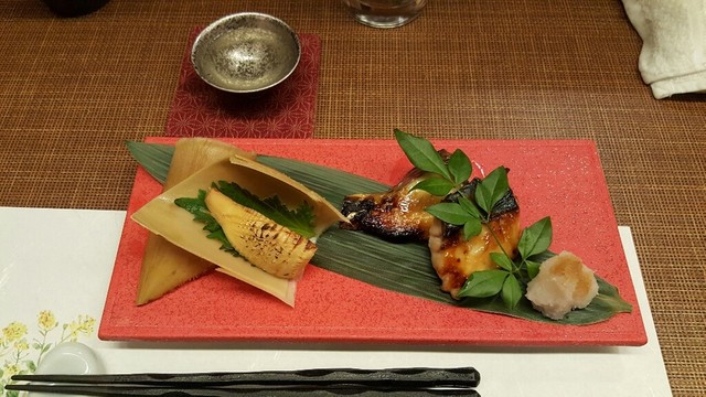 さて、当日友人と二人で行きました。お通しから一つ一つしっかりとしていてこれから始まる宴を期待させます。次はお刺身、石鯛、クエ、マグロ、鯛、平貝など素晴らしいまるで昆布締め後の様に一つ一つが豊かな味。お酒が進みます。次のサワラの蕪蒸しは旬のサワラにこれまた今一番美味しい蕪を粗くおろしており、サワラの旨味と蕪の香り瑞々しさが広がります。次はホタルイカの沖漬け。綺麗です勿論美味しい!上品です。毛ガニのほぐしの次にサワラの西京焼きと竹の子焼きが出ました❗まってました!サワラはもちろん竹の子は京都産の初物とのこと。甘い旨いいい香り!次は旬物のお碗の中にはクエの骨と鰹でとった出汁に竹の子、コゴミ、ワカメ、こしあぶら?等が入っております。もう、出汁はぐびぐび呑んでしまいます。〆はホタテのかき揚げとざるそばでした。