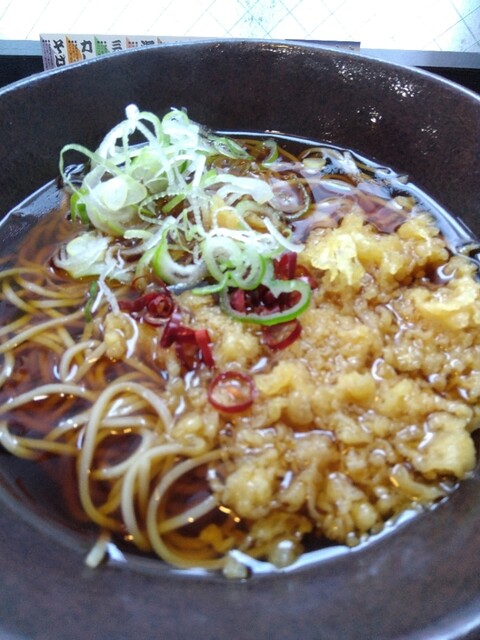 薬味コーナーで「輪切り唐辛子」と「揚玉」をトッピングした「かけそば」はなかなか豪華なお顔に変身♪
