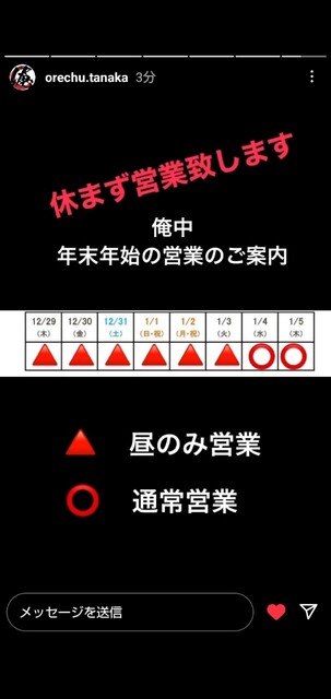 なんと年末年始は休まず営業❗写真の一番最後に「公式Instagram」から引用、曜日がズレていますが、日程は正しいそうで、本当に休まず昼営業されるとの事(゜o゜;❗