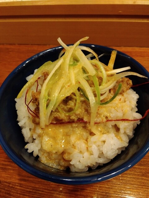 セット☆で付いてくる「ミニライス」には「ホルモン」と「白髪葱」。そしてご厚意で頂いた「辛味噌」をトッピング⤴️そこへスープをかけて「濃口醤油ホルモン茶漬け」にアレンジ(^^ゞ これがまた旨し(≧∇≦)b