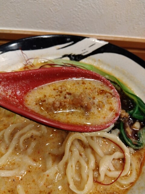 先ずはスープを一口。(゜o゜;❗❗❗ウヒョー(≧∇≦)b辛味がガツン★ときた後旨味に変わり、そして甘味を感じる癖になる味わい♥