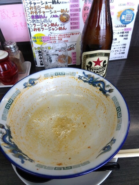 中華麺房 東龍 名取店④〜ラージャン麺(醤油)[中辛]780円+水餃子380円+サッポロ黒ラベル瓶ビール(中)520円