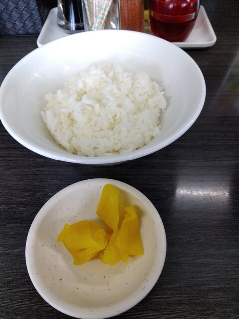 「肉玉めし」着丼\(^o^)/ 小皿には「沢庵漬け」♪