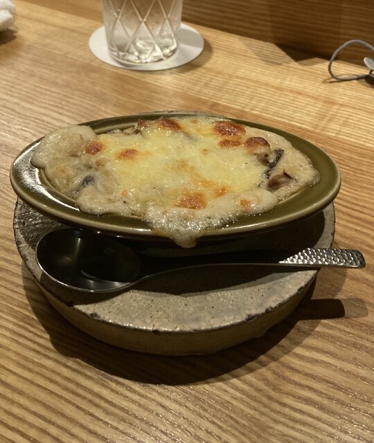 お腹に余裕があったのでアラカルトから一品オーダーしようと、白子と麻婆豆腐やエビチリを頼もうかと思いましたが、豆腐がなく、揚げ物もできないということで、鴨皮としいたけのタレ焼きを追加。