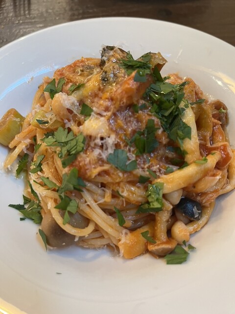 パスタは、魚介類とズッキーニのタリアテッレをチョイス。魚介の旨味成分がたっぷり染み込んだタリアテッレは美味しい! 魚介も色々な種類が沢山入っていました。