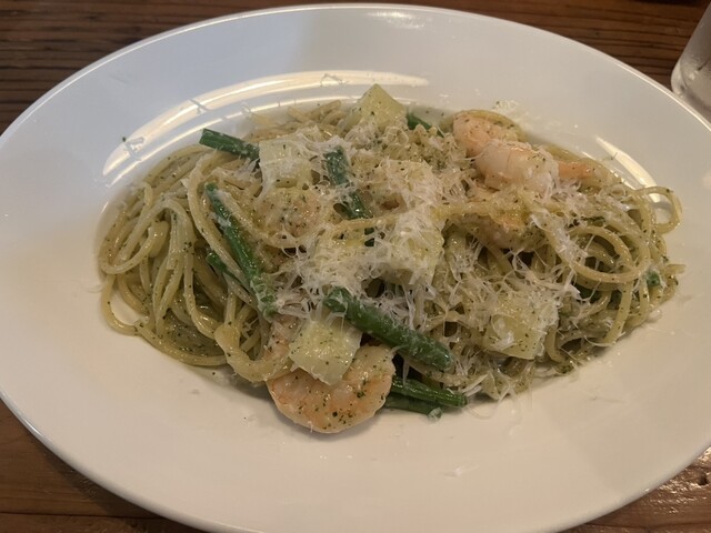 日頃は、ランチにお邪魔することが多いのですが、どーしても「ジェノベーゼ」が食べたくて、会社の同僚とディナーに行きました。出てきたジェノベーゼは、期待以上の美味しさ! 大きな帆立のソテーが3つもついて、濃厚ソースにはリングイネが絶妙にからみます。その中にスナップえんどうがシャキシャキの歯応えで旨味を重ねます。美味しい! 本物のジェノベーゼです。