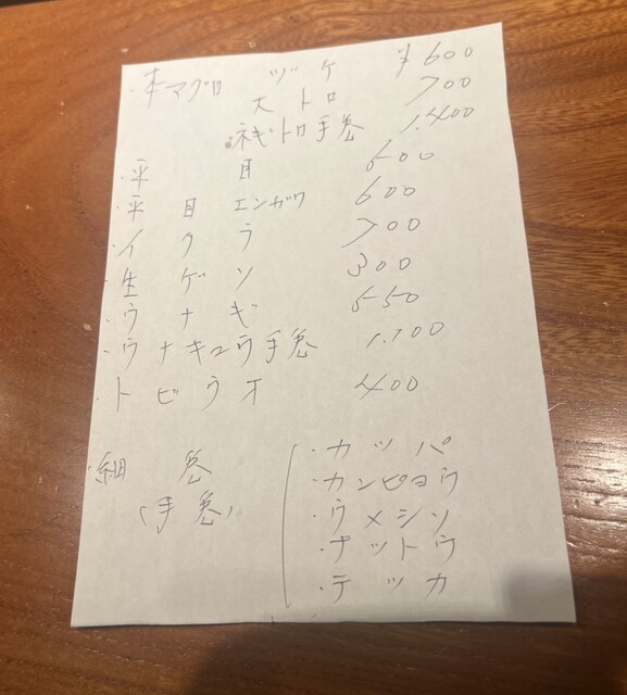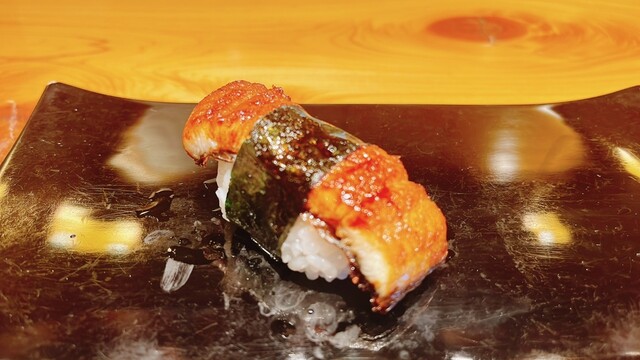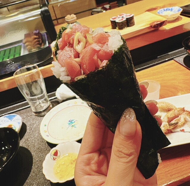 お寿司の追加もでき、それぞれ好きなものをオーダー。 トビウオ、生ゲソ、うなぎ、鉄火巻き、ネギトロ手巻き。 ネギトロ手巻きは、その場でたたいた身に白葱が刻まれたねたが下までぎっしり詰まっていて、必食の一押しです。