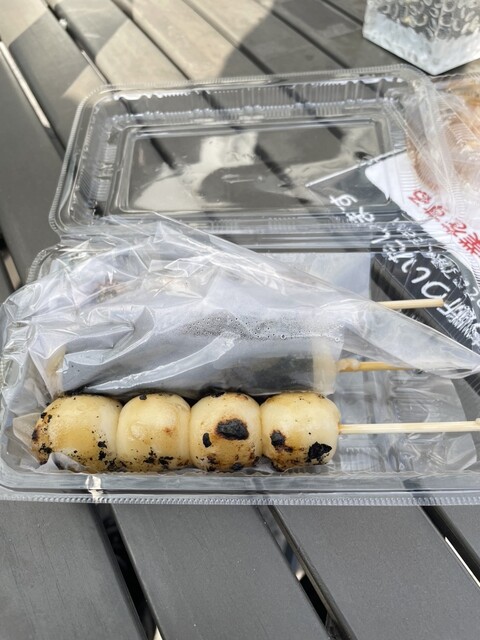 テイクアウト専門なんで表の広場で食べて見ました 食べてみると 団子と言うよりは餅のようで非常に柔らかい そんなんで入れ歯なんかの人は歯にくっつくかもしれませね