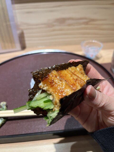 甘いタレをまとったパリパリふわふわな鰻は熱々、瑞々しいキュウリは冷たーくて、熱いのと冷たいのが口の中で踊っております。そこに美味しい海苔がこの両者を取り持ってくれる。旨い…