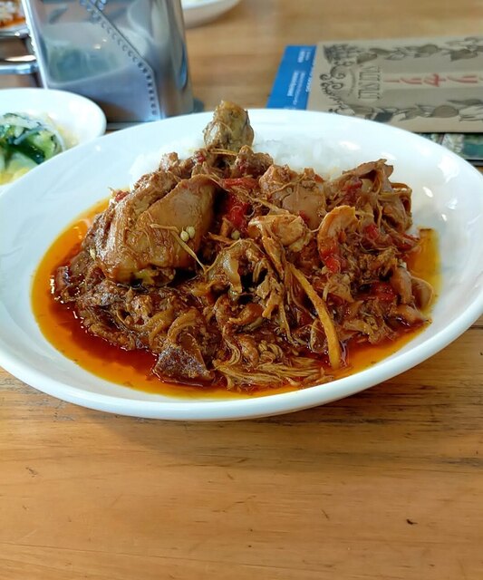 水を使わずスパイスと塩のみで煮込んだカレー。パキスタンの家庭で食べるカレーだそう。鶏肉がホロホロになるまで煮込まれており骨まで食べられると。辛さはさほどでもありません。鶏やら野菜の旨味とスパイスが程よくいい感じ。オイリーなのは煮込んで出た鶏油でしょうか。以前はもっと熟成された感じでしたが、今回のはフレッシュな感じ。日本のカレーとは全く違いますが、相変わらず美味しいです♪