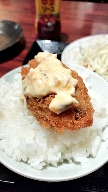 定食のカキフライを単品で頼めるのか聞くと、前のお客さんで牡蠣はなくなりましたと(T_T)開店と同時に来たけど品切れでした。この日は仕入れが6個の様子。残念。ちなみに前のお客さんの牡蠣フライをチラ見すると、大粒とあるが大きさは普通に見えました。結局牡蠣が単品で頼めるかは分からず^^;
