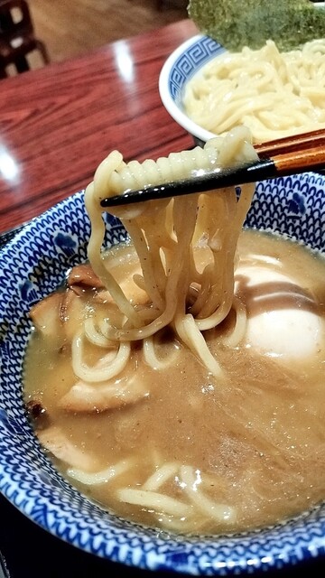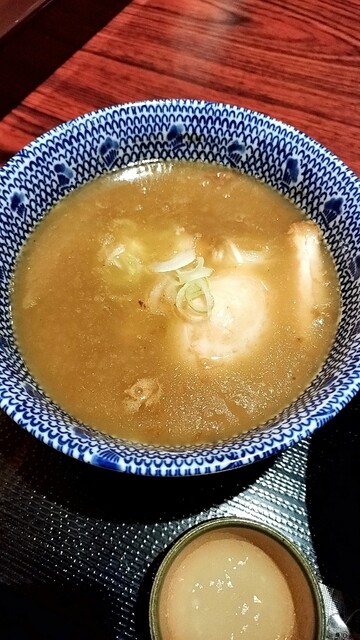 つけ汁は動物系×魚介の王道ですが、魚粉でのドロドロザラザラは控えめ、ややとろみがありオイリーなスープです。海苔以外のトッピングはつけ汁に入っている模様。