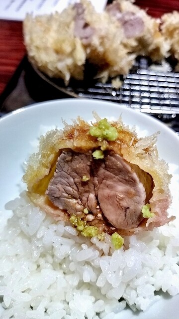 薄めの牛肉が2枚。牛カツのイメージはもう少し分厚くて、中が真っ赤でカツオのたたきのようなのを想像してましたが、ここのは少し違うようだ。断面をみると切れ目が多く、ミートハンマーでかなり叩かれたようにも見える。スジを一生懸命取ってくれたのだろうか。食感がかるーくなりすぎて肉塊をたべている気はあまりしません。わさび醤油で食べます。味はいいがやっぱ何か物足りない。調味料は言えばソースや塩でも頂けます。