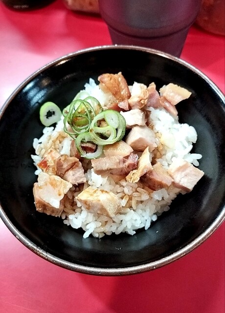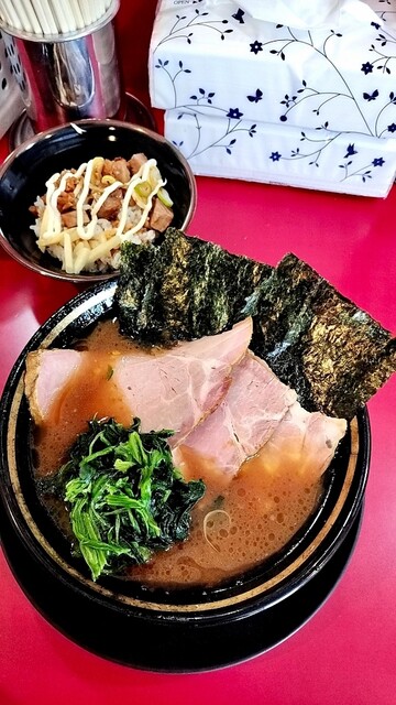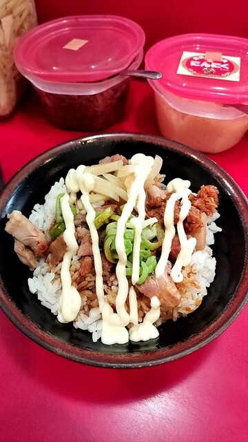 先に半賄い飯からきたので、刻み生姜、ライス用ニンニク、マヨネーズでカスタマイズして待ちます。程なくして着丼。うまそ~(>ω<)