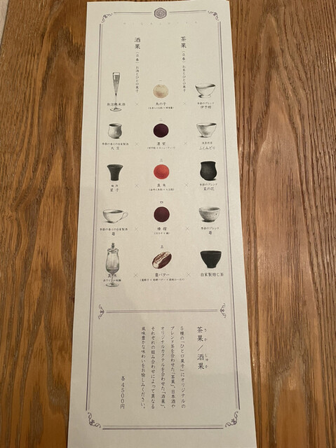 お酒と和菓子をペアリングでいただける酒果のコースをいただきました!最初は団子サイズのお菓子5種類では少し物足りないかと懸念していましたが、大満足のコースでした。他の人にも勧めたい!!