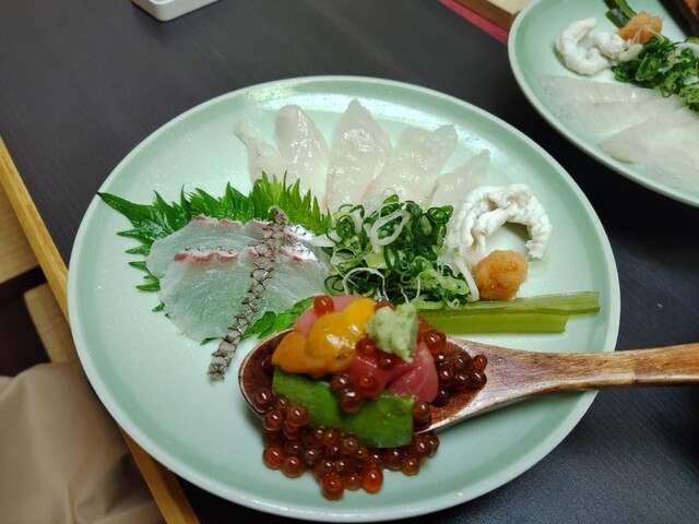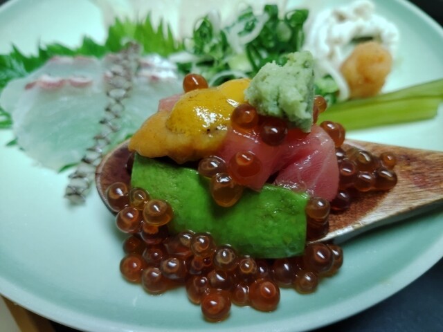 続いて河豚のてっさ、鯛、木製スプーンの中にアボカド、脂ののったマグロ、雲丹にいくらが溢れてます。お店の方は一口で、と言ってましたが一口で入るわけがないサイズ(笑っ