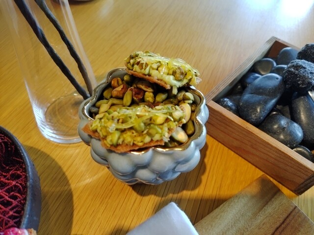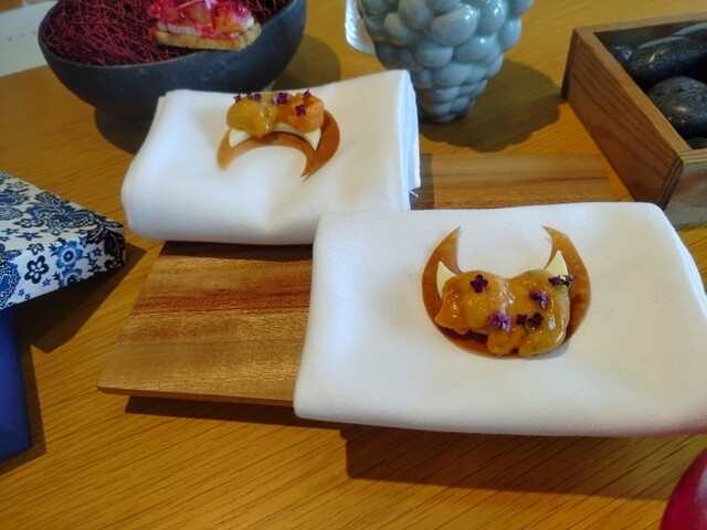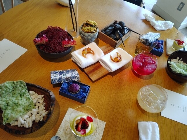 アセロラのドリンクがショットグラスで来た!泡の方は温かく下は冷たい不思議な飲み物、口の中が面白い次のメニューは始まりと書いてあるが料理なのか、ここからスタートなのか?と話していたら、始まりヤバイ7種の前菜達が一斉に!どれから行こうか迷う~特に紅芋のパイが燻製の良い香りがして長い間口に残ります