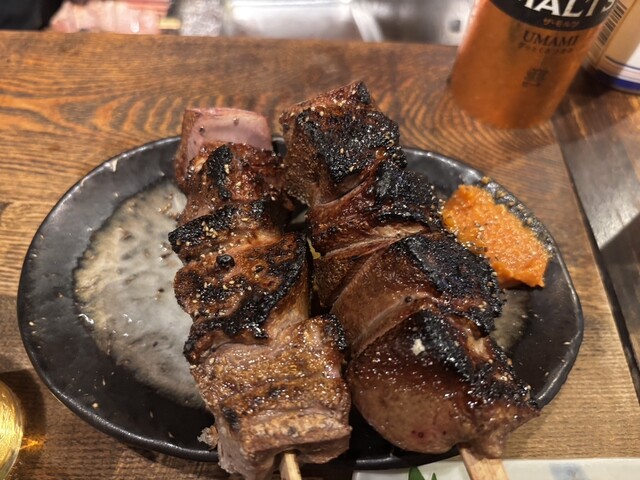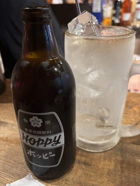 赤星で乾杯して、レバーと刺身盛合わせ、串をもう一本頼んでホッピーセットと中を頼んで終了。