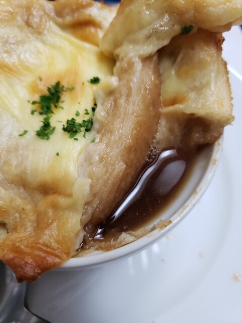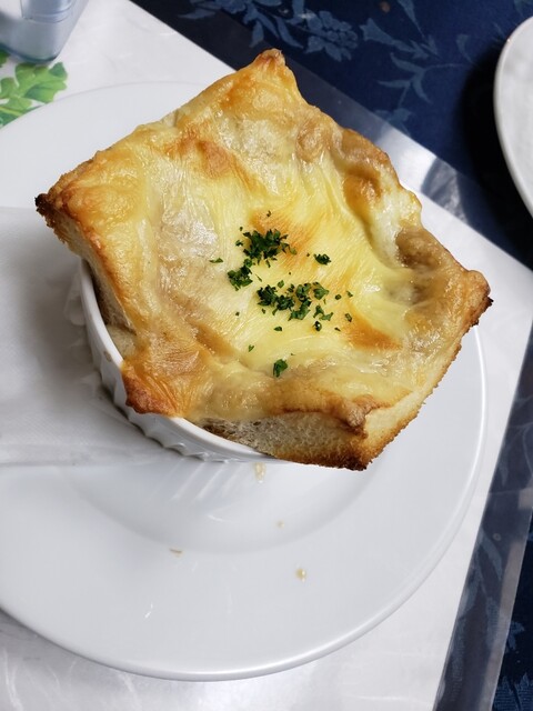 オニオンスープは甘さと濃さが上に乗った薄手のチーズトーストと合わさり、12月になり急に冷えた身を暖める。