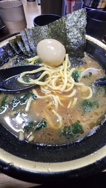 ラーメンを注文。家系らしい濃いめの豚骨醤油スープに、太めのストレート麺がしっかり絡む安定感のある一杯です。味玉は程よい半熟で、スープとの相性も良好。海苔やほうれん草も王道で、最後までバランスよく食べられました。
