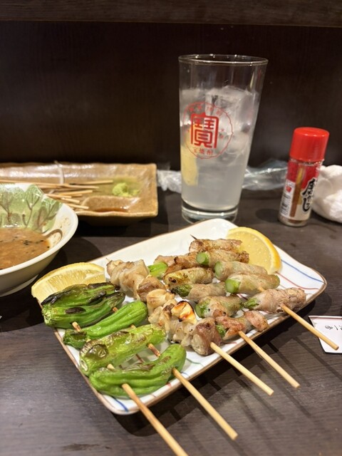 食べたもの:もつ煮込み、とり刺し、とりししとう、レバー、砂肝、トマト巻き、アスパラ巻き、銀杏、つくね