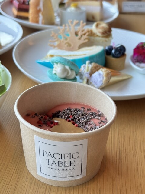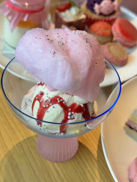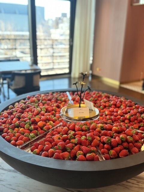 ピンクを基調とした華やかなデザートルームにぴったりな苺尽くしのデザートに、主役は旬の国産いちご3種が詰まった巨大いちごボウル