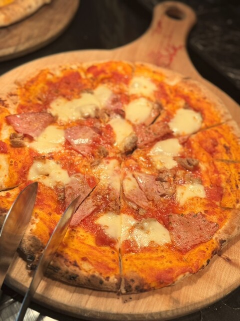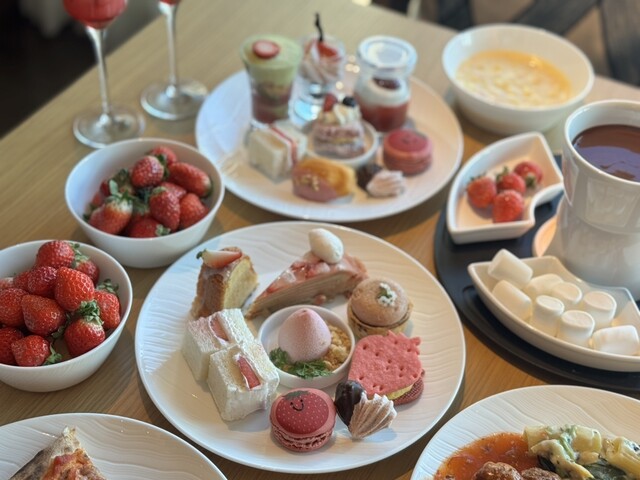 デザートだけでなくサラダバーやホットディッシュコーナーも窯で焼いた本格ピザやカレーががっつり揃っていてデザートルームとの往復が止まらない
