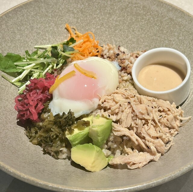 私が選んだのは「柚子胡椒チキンとアボカド、温泉卵のどんぶり」(税込1,188円)。十穀米の上に、チキン、アボカド、温泉卵、オクラ、にんじん、紅芯大根など10品目の食材が美しく盛られています。プチプチ、シャキシャキ、しっとり、まろやか…と、口の中で変化する食感がなんとも楽しい!メインの柚子胡椒チキンはほんのりピリッと風味豊かで、胡麻ポン酢ダレとの相性も抜群でした。