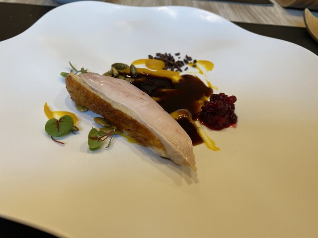 ⑨岩手のホロホロ鳥、カボチャの種とカボチャのソースと昆布といりこだしの赤ワインソース、カカオニブとベリー添え